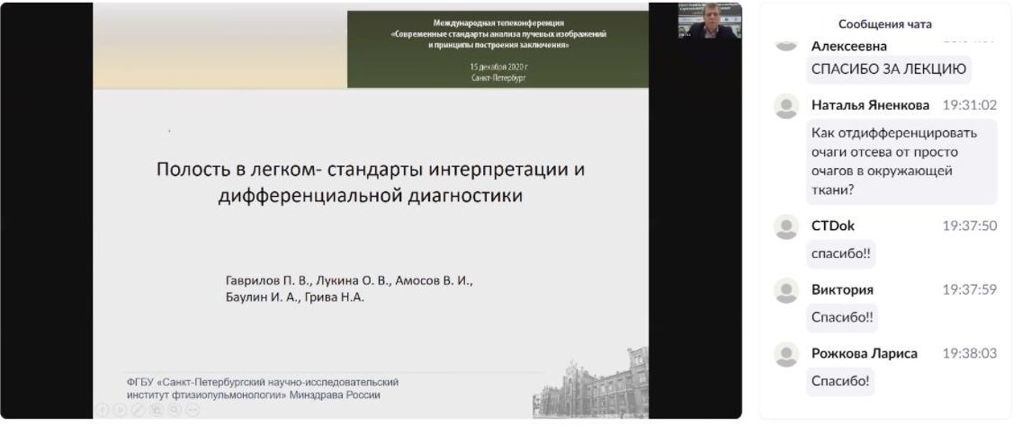 В работе телеконференции принял участие ведущий научный сотрудник, руководитель направления «Лучевая диагностика» к. м. н. Гаврилов П. В. с докладом «Полость в легком- стандарты интерпретации и дифференциальной диагностики».